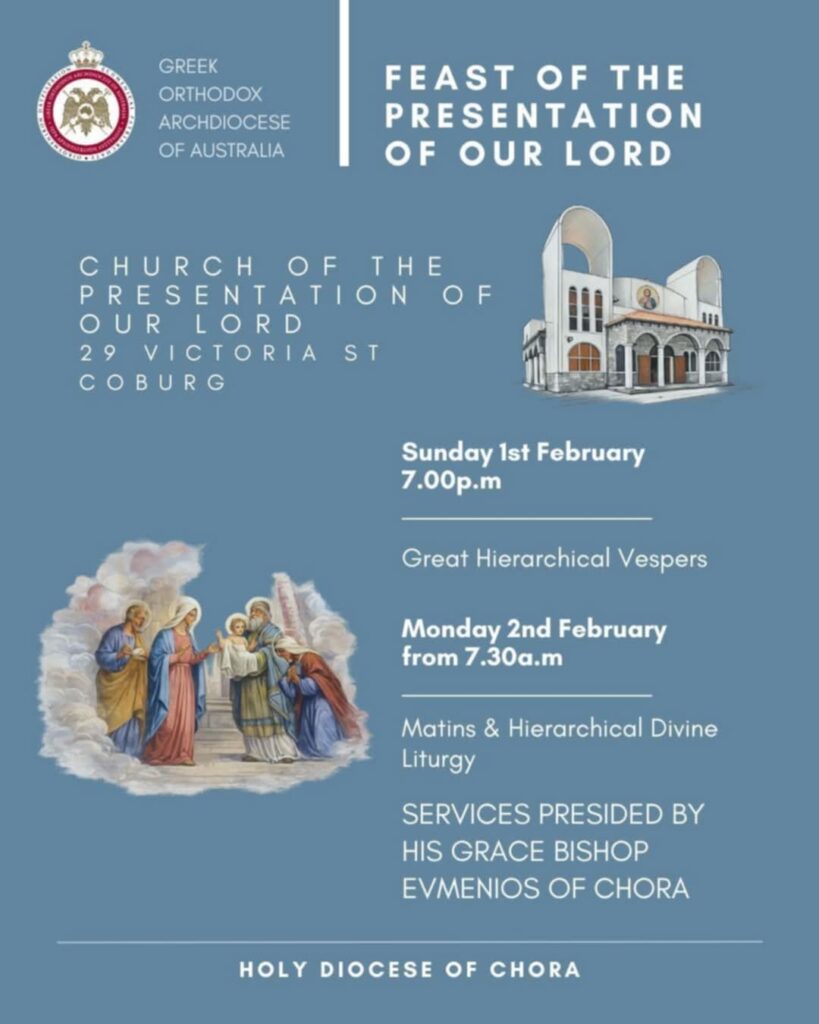 Εκδηλώσεις Το πανηγυρικό πρόγραμμα της εορτής της Υπαπαντής του Κυρίου στο Coburg by Omogeneia Team 29 Ιανουαρίου, 2026 από Omogeneia Team 29 Ιανουαρίου, 2026 0 comment 94 Επισκοπή Χώρας: Ιερός Ναός Υπαπαντής του Κυρίου, Coburg Το πανηγυρικό πρόγραμμα της εορτής της Υπαπαντής του Κυρίου Το πρόγραμμα των Ιερών Ακολουθιών έχει ως εξής: Κυριακή 1 Φεβρουαρίου, 7.00 μ.μ. Μέγας Αρχιερατικός Εσπερινός. Δευτέρα 2 Φεβρουαρίου, από 7.30 π.μ. Όρθρος και Πανηγυρική Αρχιερατική Θεία Λειτουργία. Των Ιερών Ακολουθιών θα προεξάρχει ο Θεοφιλέστατος Επίσκοπος Χώρας κ. Ευμένιος Κυριακή 8 Φεβρουαρίου – πανήγυρις Αρχιερατική Θεία Λειτουργία 7.30 π.μ Θα ακολουθήσει το Ελληνικό πατροπαράδοτο πανηγύρι Μουσική – παιδικές δραστηριότητες – περίπτερα Share 0 FacebookTwitterPinterestEmail Omogeneia Team Προηγούμενο Το εναρκτήριο λάκτισμα του Ελληνικού Κυπέλλου γυναικών της EKM αυτή την Παρασκευή Επόμενο Παναγία Καμαριανή Red Hill: Η γιορτή των σταφυλιών ΔΕΙΤΕ ΕΠΙΣΗΣ «Πίννε κρασίν, να ‘σιεις ζωήν» – Κυπριακό Φεστιβάλ Φαγητού & Κρασιού 2026! 30 Ιανουαρίου, 2026 Παναγία Καμαριανή Red Hill: Η γιορτή των σταφυλιών 29 Ιανουαρίου, 2026 ΘΕΟΦΑΝΕΙΑ 2026 – Παραλία RYE 1 Ιανουαρίου, 2026 Μελβούρνη: Πρόγραμμα Πανηγύρεως του Ι.Ν. Εισοδίων της Θεοτόκου North Balwyn 18 Νοεμβρίου, 2025 Έκθεση Ελληνικού βιβλίου ΄25 11 Νοεμβρίου, 2025 Παρουσίαση του 38ου τεύχους του Περιοδικού “Ο Λόγος” 10 Νοεμβρίου, 2025