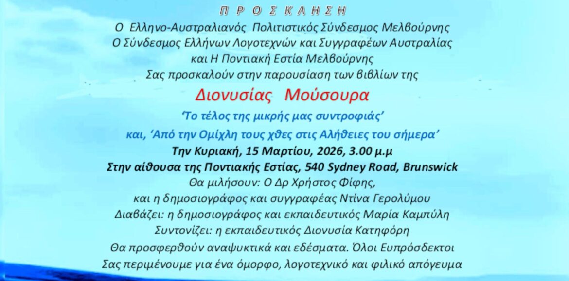 «Το τέλος της μικρής μας συντροφιάς» και «Από την ομίχλη του χθες στις αλήθειες του σήμερα» της καταξιωμένης συγγραφέως Διονυσίας Μούσουρα, την Κυριακή 15 Μαρτίου 2026, στις 3.00 μ.μ., στην αίθουσα της Ποντιακής Εστίας Μελβούρνης, 540 Sydney Road, Brunswick.