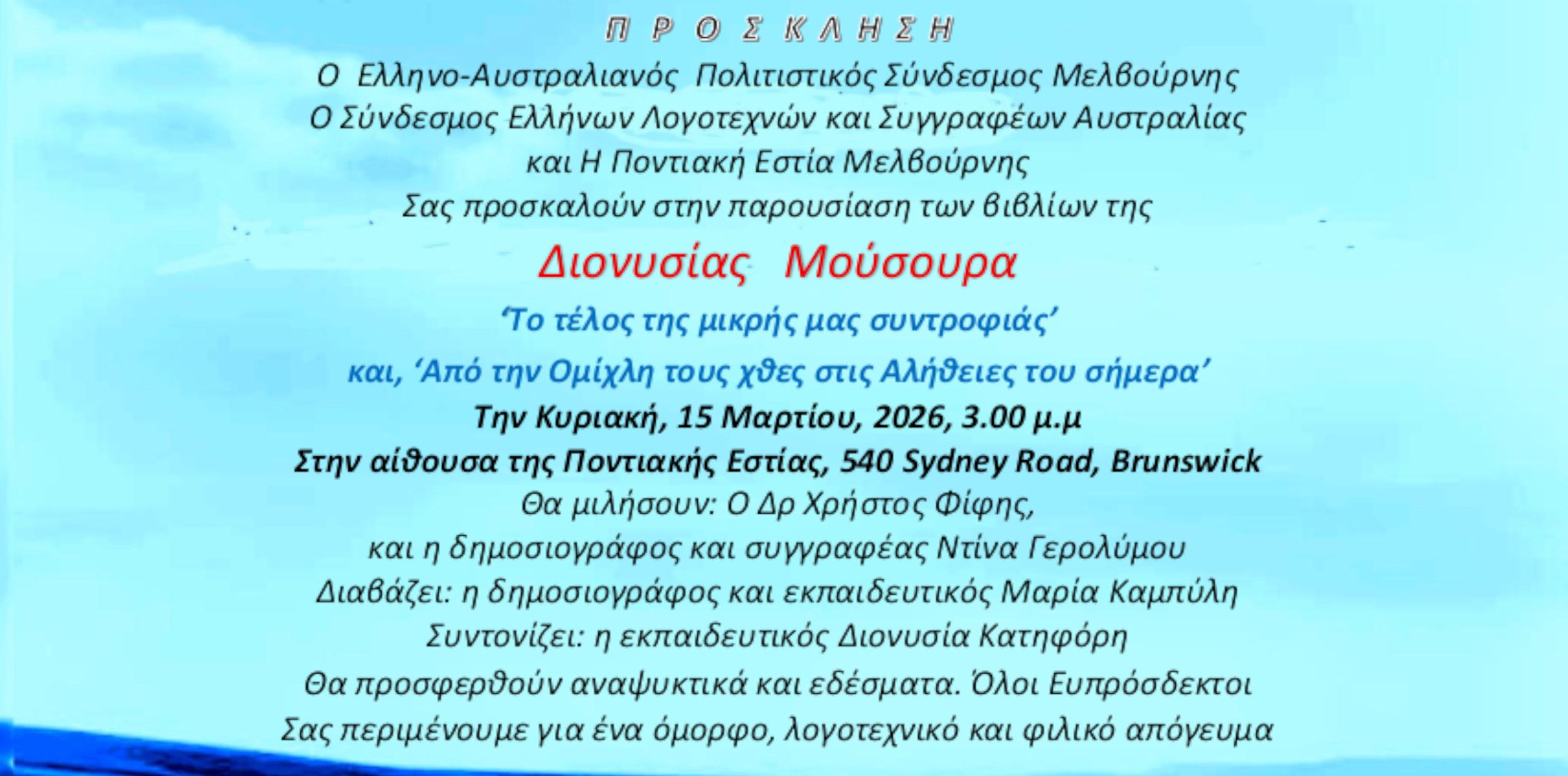 by the esteemed author Dionysia Mousoura, on Sunday, 15 March 2026, at 3:00 p.m., at the Pontiaki Estia Melbourne Hall, 540 Sydney Road, Brunswick.