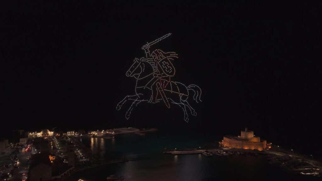 Ο ουρανός της Ρόδου μετατράπηκε σε καμβά φωτός, όπου αναβίωσε το αρχαίο θαύμα του Κολοσσού της Ρόδου και μαζί του εμβληματικά σύμβολα του νησιού: τα ελάφια, η Κοιλάδα των Πεταλούδων, οι Ιππότες και ο Ολυμπιονίκης Διαγόρας.