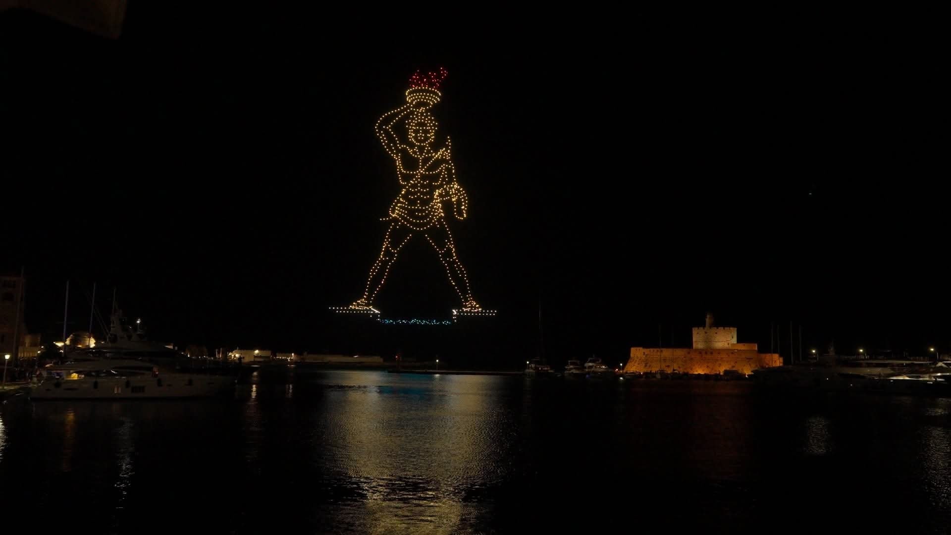 Ο ουρανός της Ρόδου μετατράπηκε σε καμβά φωτός, όπου αναβίωσε το αρχαίο θαύμα του Κολοσσού της Ρόδου και μαζί του εμβληματικά σύμβολα του νησιού: τα ελάφια, η Κοιλάδα των Πεταλούδων, οι Ιππότες και ο Ολυμπιονίκης Διαγόρας.