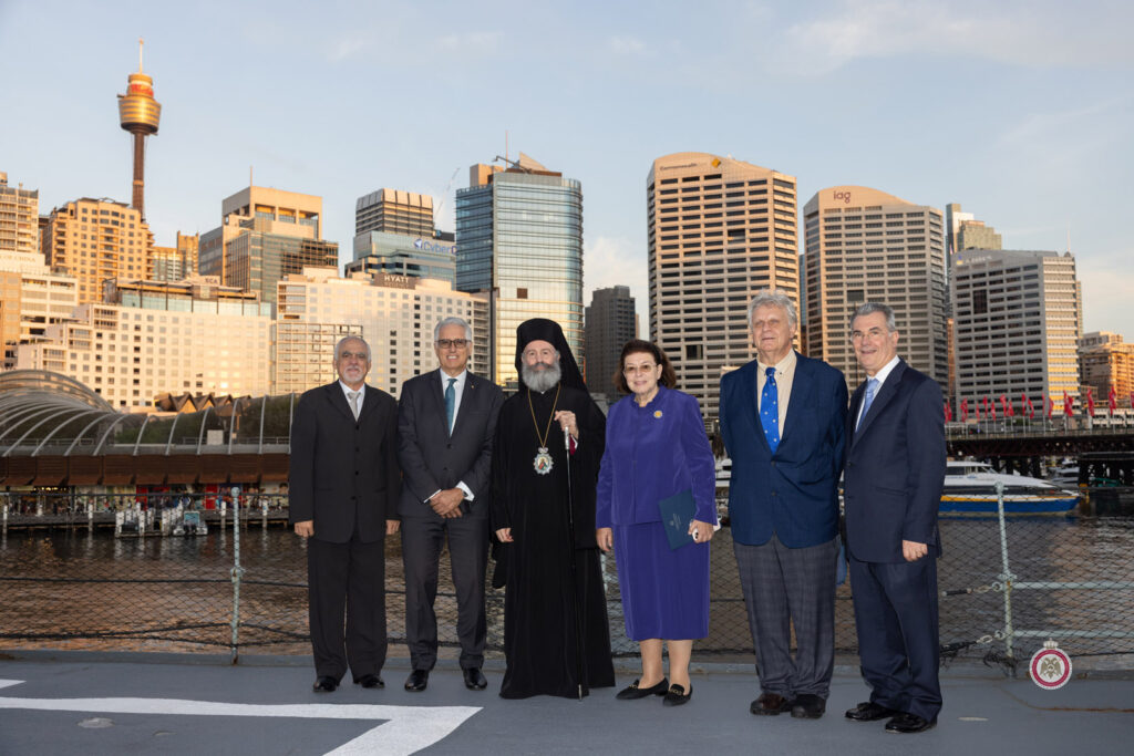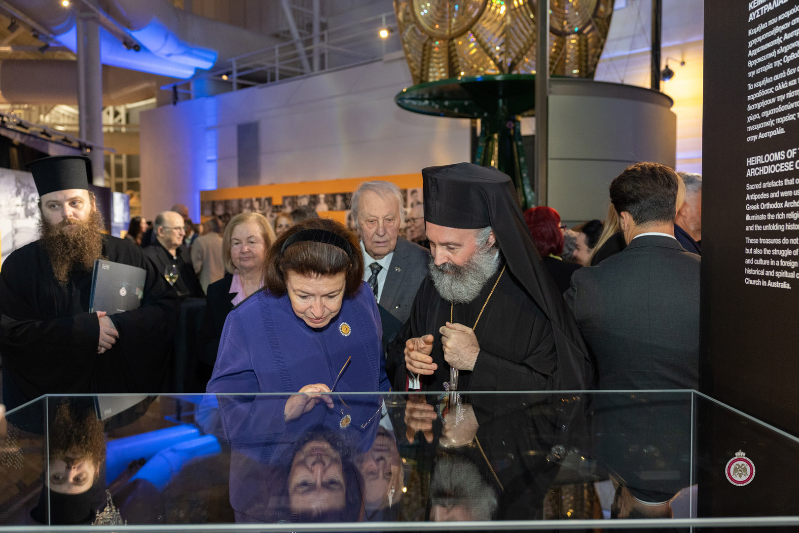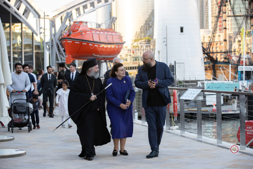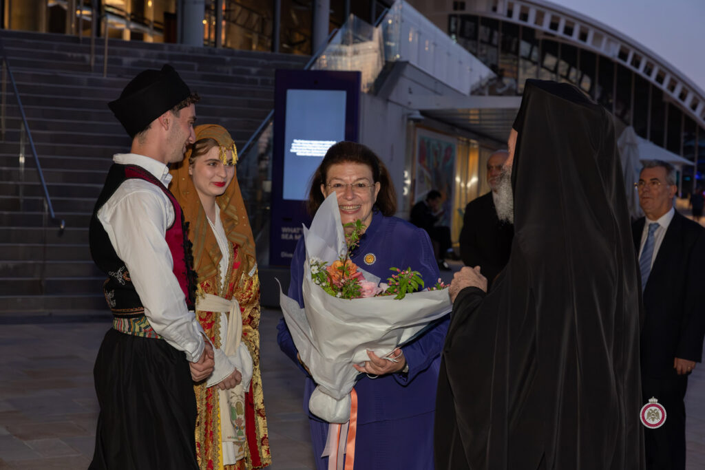 Την εκδήλωση τίμησαν με την παρουσία τους ο Σεβασμιώτατος Αρχιεπίσκοπος Αυστραλίας κ.κ. Μακάριος και η Υπουργός Πολιτισμού της Ελλάδος, κ. Λίνα Μενδώνη, συνοδευόμενη από την Ειδική Σύμβουλό της, κ. Άννα Παναγιωταρέα, και άλλους συνεργάτες της. Αρχικά, ο Αρχιεπίσκοπος και η Υπουργός ξεναγήθηκαν στο Εθνικό Μνημείο Μετανάστευσης της Αυστραλίας, τον επονομαζόμενο «Τοίχο Υποδοχής», καθώς και στους χώρους του πολεμικού πλοίου που εκτίθεται στο Εθνικό Ναυτικό Μουσείο. Στη συνέχεια, κατά την είσοδό τους στην αίθουσα όπου φιλοξενήθηκε η εκδήλωση, την κ. Μενδώνη καλωσόρισαν νεαρά μέλη του Λυκείου Ελληνίδων του Σύδνεϋ, προσφέροντάς της μία ανθοδέσμη. Προς τιμήν της καταγομένης εκ της νήσου Χίου Υπουργού, ένα νεαρό αγόρι ήταν ενδεδυμένο με παραδοσιακή χιώτικη φορεσιά.