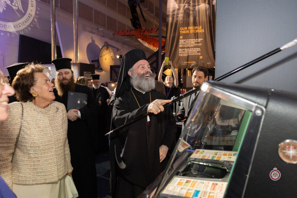 Έπειτα, ο Σεβασμιώτατος ευχαρίστησε τους συντελεστές του έργου και ιδιαιτέρως τον Διευθυντή και πρωτεργάτη του, κ. Μάρκελλο Πετρόπουλο, εξαίροντας τον ζήλο και την αφοσίωσή του. Ευχαρίστησε, επίσης, τους χορηγούς και υποστηρικτές, ενώ έκανε ειδική μνεία στο Υπουργείο Πολιτισμού της Ελλάδος, το οποίο έχει θέσει υπό την αιγίδα του το έργο «Our People, Their Stories» και προσφάτως το επιχορήγησε με το ποσό των 120.000 ευρώ. Απευθυνόμενος, μάλιστα, προσωπικά στην κ. Μενδώνη, αναγνώρισε ότι «ενστερνίστηκε εξαρχής το φιλόδοξο όραμά μας, αγκάλιασε ολοπρόθυμα την πρωτοβουλία μας και μας προσέφερε ό,τι περισσότερο έχουμε ανάγκη οι Έλληνες της Διασποράς – την ηθική επιβεβαίωση ότι η Πολιτεία της φιλτάτης πατρίδος μας βρίσκεται κοντά μας, μας αφουγκράζεται, μας νοιάζεται, εκτιμάει και τιμάει εμπράκτως την ιστορία που γράφεται από τις Ελληνίδες και τους Έλληνες καί εκτός των συνόρων της Ελλάδος».