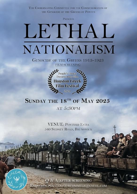 Η προβολή του αγγλόφωνου ντοκιμαντέρ θα πραγματοποιηθεί την Κυριακή 18 Μαΐου στην αίθουσα της Ποντιακής Εστίας, 540 Sydney Road, Brunswick. Η είσοδος είναι ελεύθερη.