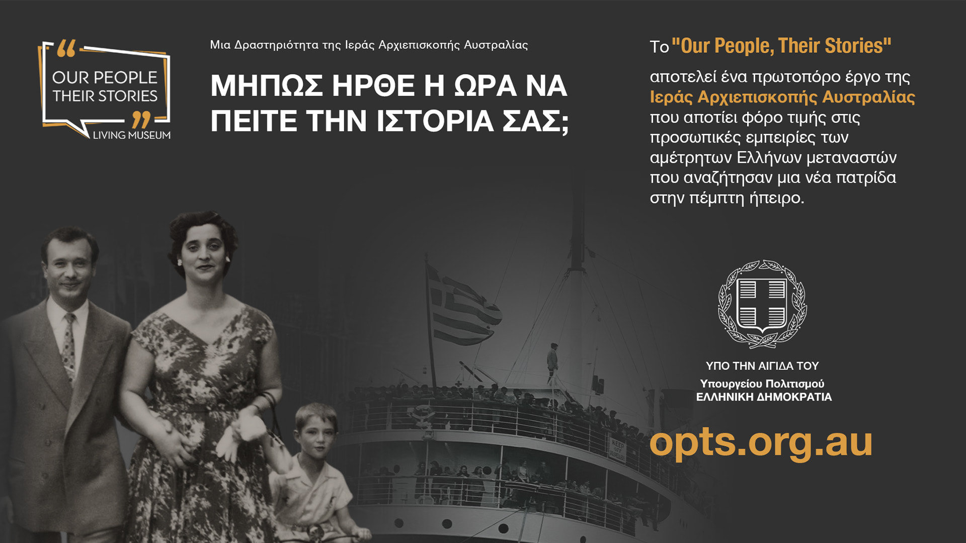 Η Ιερά Αρχιεπισκοπή Αυστραλίας ανακοινώνει τη διοργάνωση επετειακής εκδηλώσεως στο Σύδνεϋ, με την ευκαιρία της συμπληρώσεως ενός έτους λειτουργίας του «ζωντανού» Μουσείου «Our People, Their Stories» (www.opts.org.au).