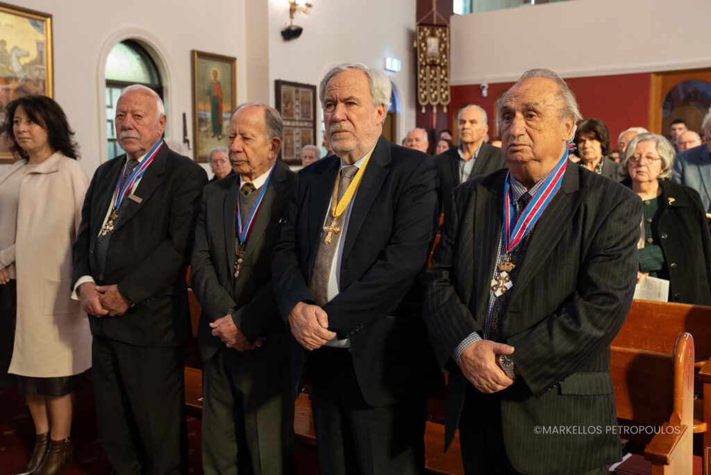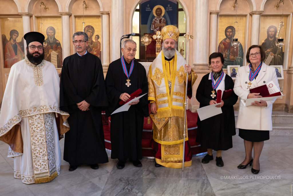 Ακολούθησε, μέσα σε ατμόσφαιρα πνευματικής χαράς και συγκινήσεως, η απονομή του Παρασήμου του Τάγματος των Φιλοχρίστων σε τρία μέλη της Ενορίας με πολυετή και πολύτιμη, ανιδιοτελή προσφορά. Συγκεκριμένα, τιμήθηκαν και δέχθηκαν τις ευγνώμονες ευχαριστίες του Ποιμενάρχου τους: ο κ. Γεώργιος Παπακωνσταντίνου, ο οποίος κοσμεί επί πολλά έτη το ιερό αναλόγιο του Ι. Ναού Αγίου Γερασίμου, η κ. Αφροδίτη Καλοθέου, η οποία έχει αφιερωθεί στη θυσιαστική προσφορά προς τον πλησίον μέσα από τη διακονία της στη Φιλόπτωχο Αδελφότητα της Ενορίας, και η κ. Ζωή Καρτσωνάκη, η οποία υπηρετεί στο Κατηχητικό και στο Ελληνικό σχολείο ήδη από τα πρώτα βήματα της Ενορίας.